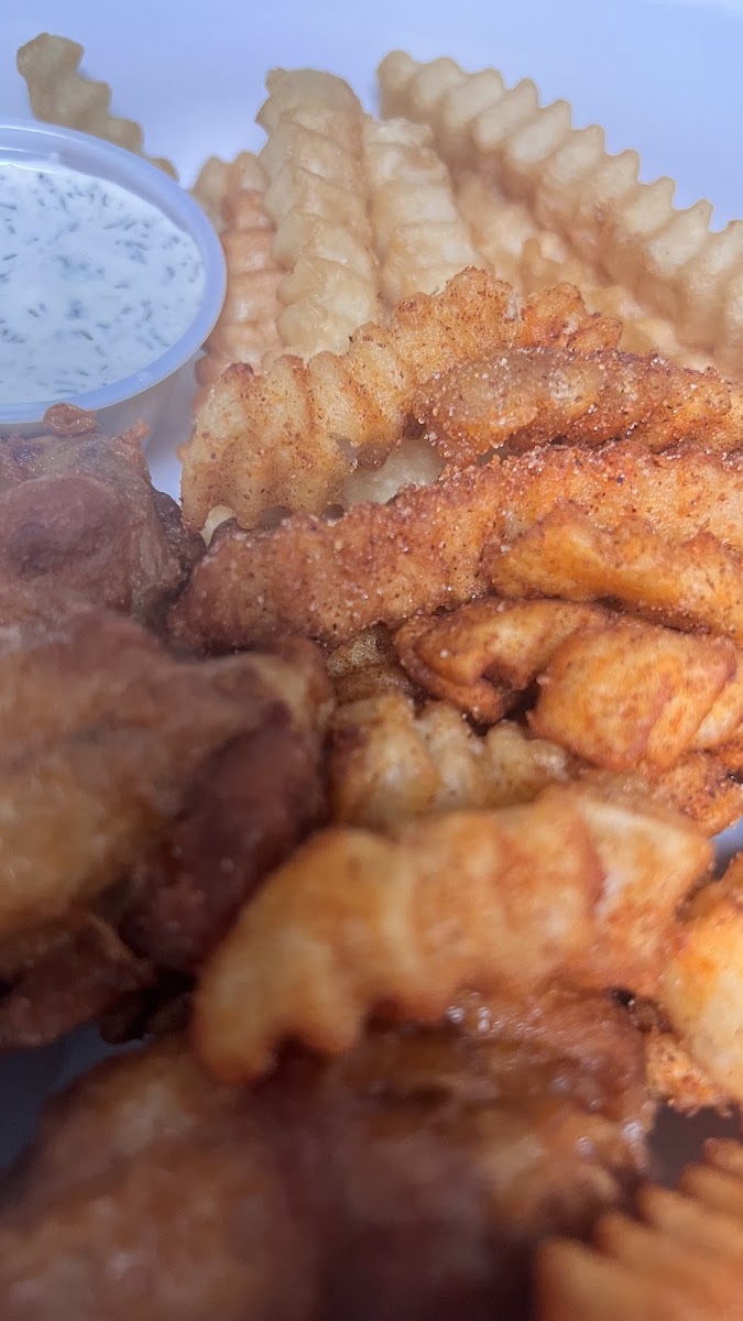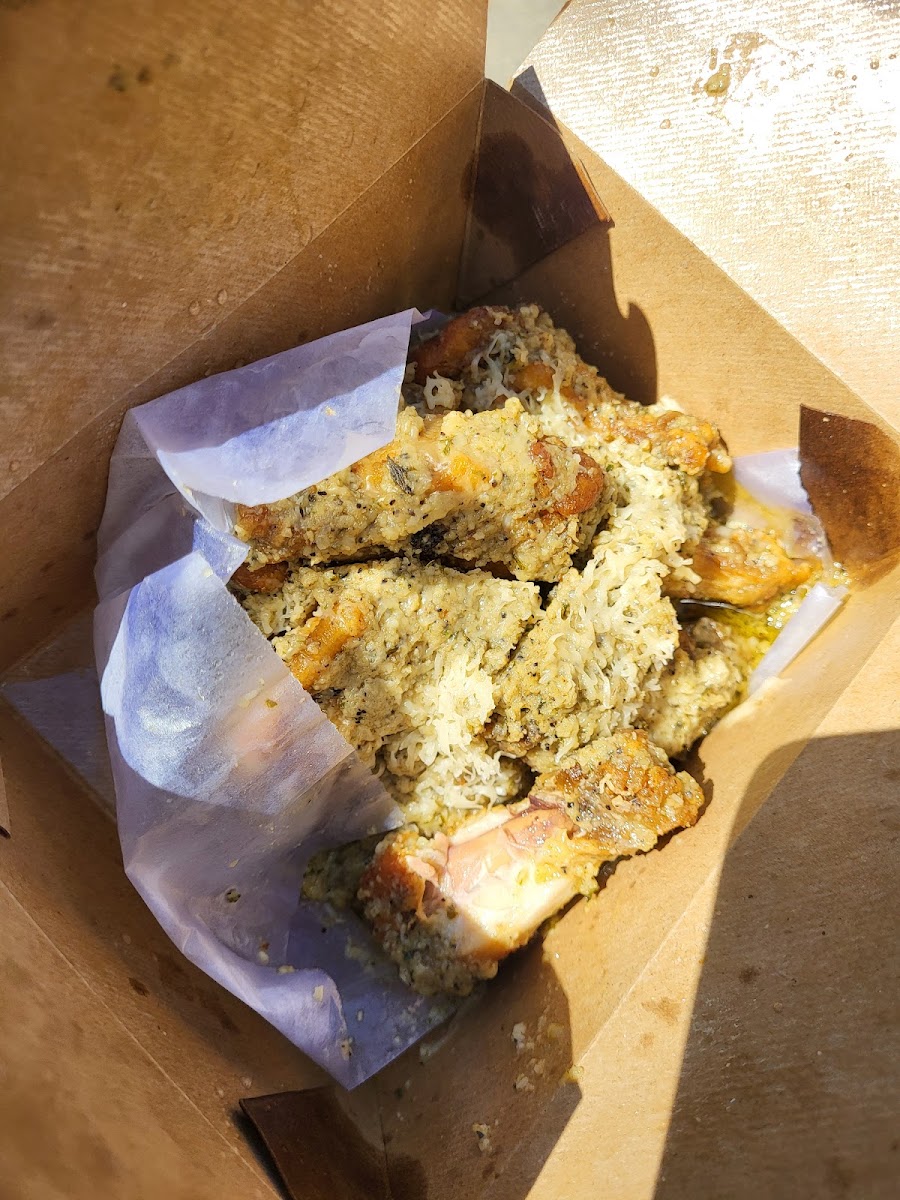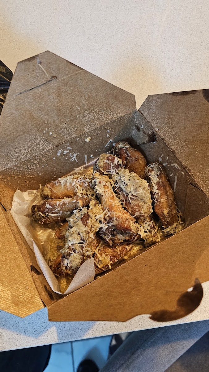 Ranch- 10/10 Fries- 4/10 too crunchy-not a fan of double fried fries- And these were .. I also asked for sub fries and didn’t get them … Sweet Tea- .5/10 … tea good but taste bad (if that makes sense-taste either it’s out of date or wasn’t kept properly before bottling) I drink tea everyday so I know when it’s off .. has potential though Fiery Garlic Parm Wings- 8/10 the flavor was spot on ! Messy but good! All in all this place is pretty decent. It’s not really a dine in place but has limited seating outside. The staff was friendly so no issues there. I’ll for sure be back.